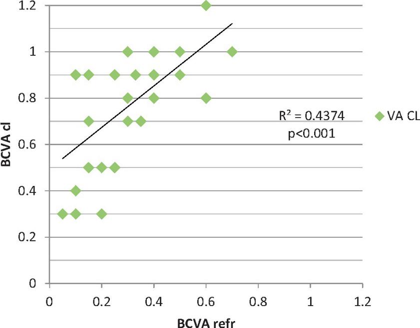 Середня загальна НКГЗКЛ становила 0,78 ± 0,25 (діапазон 0,3-1,2). Не було клінічно значущої різниці в НКГЗКЛ між групами лікування (0,8 ± 0,3 у групі I проти 0,75 ± 0,2 у групі II). Середня НКГЗrefr становила 0,30 ± 0,18 (діапазон 0,05-0,7). У всіх очах спостерігалося значне підвищення гостроти зору зі склеральними лінзами (рис. 2) порівняно з ГЗ, скорегованою окулярами (р < 0,0001, парний t-тест). Поліпшення НКГЗ, що визначається як приріст двох або більше десяткових ліній гостроти, спостерігалося на 31 оці (94%). З точки зору функціонального зору, 23 пацієнти (82%) досягли гостроти зору за Снелленом 0,5 або вище.