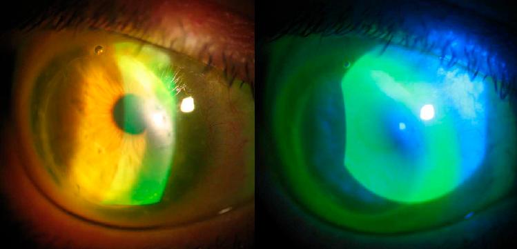 Рис. 4. Субепітеліальний фіброз донорської тканини, розташованої поблизу хазяїн-донор з’єднання (зліва). Фіброз пов’язаний з носінням рогівки контактної лінзи (праворуч) через зміну профілю рогівки (рецидивна ектазія)